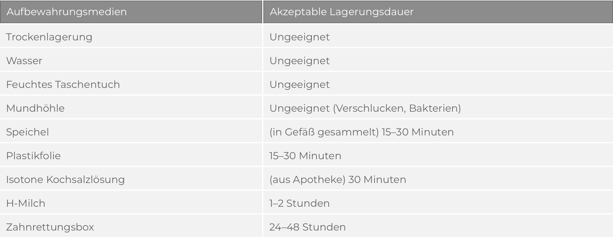 If no tooth rescue box is available after a dental accident, other storage options can also be considered as a temporary measure. However, they cannot prevent the continuous death of cells, but only delay it for a short time. Therefore, they should be replaced with a tooth rescue box as quickly as possible.
