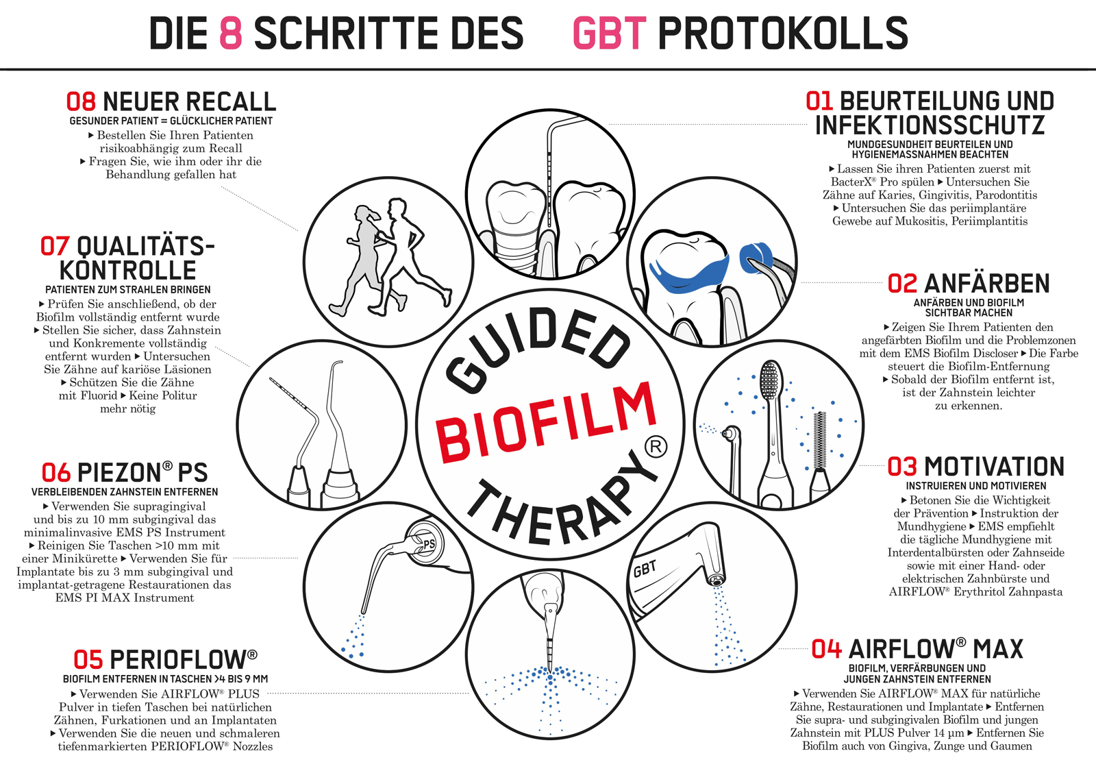 Guided Biofilm Therapy consists of 8 consecutive treatment steps based on individual patient diagnosis and risk assessment to achieve optimal results for the patient’s benefit. The treatment is carried out in the least invasive way, while ensuring maximum comfort, safety, and efficiency.