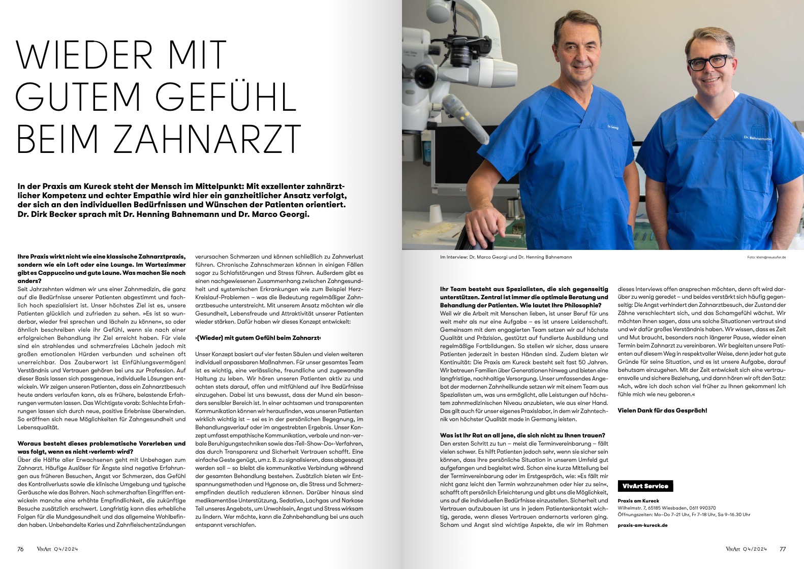 Die Praxis am Kureck ist spezialisiert auf den Umgang mit „Zahnarztangst“ und „mulmigen Gefühlen“. Das angenehme, ruhige Ambiente der Praxis, die Organisation und die Ausbildung der Ärzte und Helferinnen sorgen für ein Gefühl des Wohlbefindens und der Sicherheit – vor und nach der Behandlung. Lesen Sie hier einen Artikel aus der Zeitschrift Vivart.